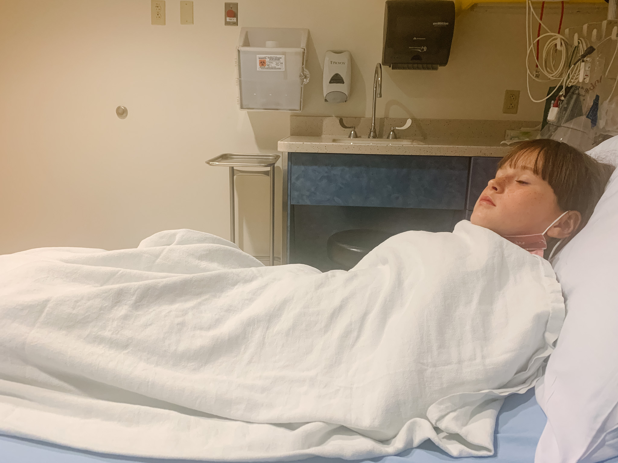 Eventually Avery got a room and later on a doctor came and was able to cut the hook and pull it through. No tetanus shot needed because she's up to date with her immunizations, and no sedation but they did use a shot to numb the area.